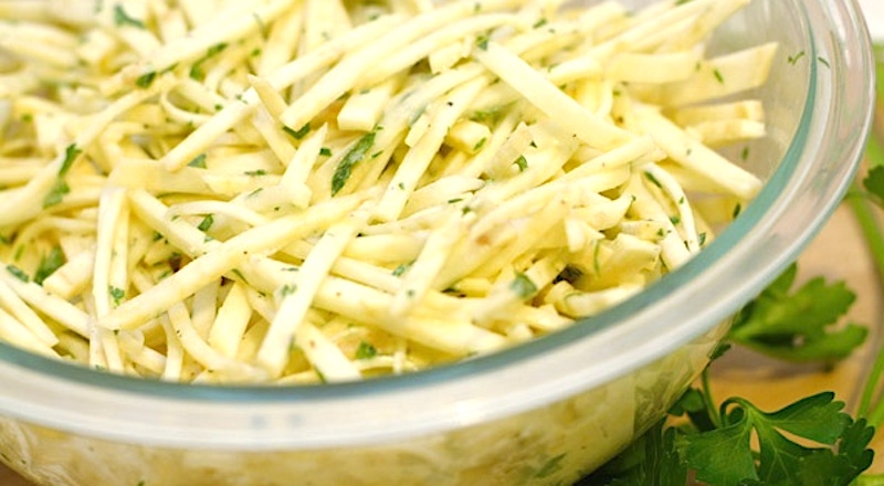 "So crisp and sweet, it is a shame to cook them. Prepare as a salad or celeriac remoulade. First, grate or julienne the raw roots.