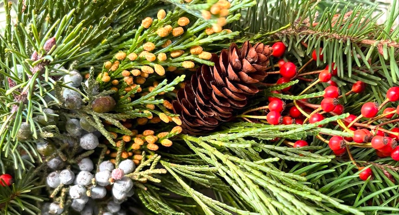 Photos: Detail of wreath from Maggy's Farm in Oregon City available from their farmstand and the Oregon City Farmers Market (top); Santa cow and friend at TMK Creamery and Distillery in Canby; tinned fish tower from Oregon's Choice Gourmet Albacore in Corvallis; Essential Shellfish box set by Cynthia Nims from Seattle's Book Larder.