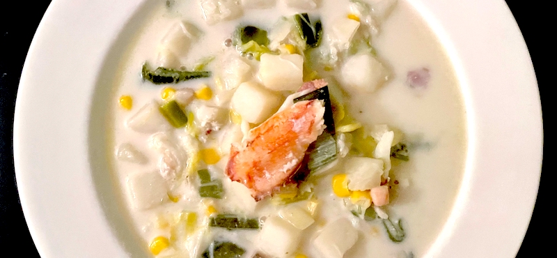 "In Sam’s recipe for what he calls Scotian Lobster Chowder (the name, he says, because he learned to make it in Nova Scotia), you can see his thoughtfulness coming to play: the freshly steamed lobster, the specificity of russet potatoes, the density of the thick Jersey cream, the gentle stewing of the leeks in butter, the emphasis on shoe-peg corn."